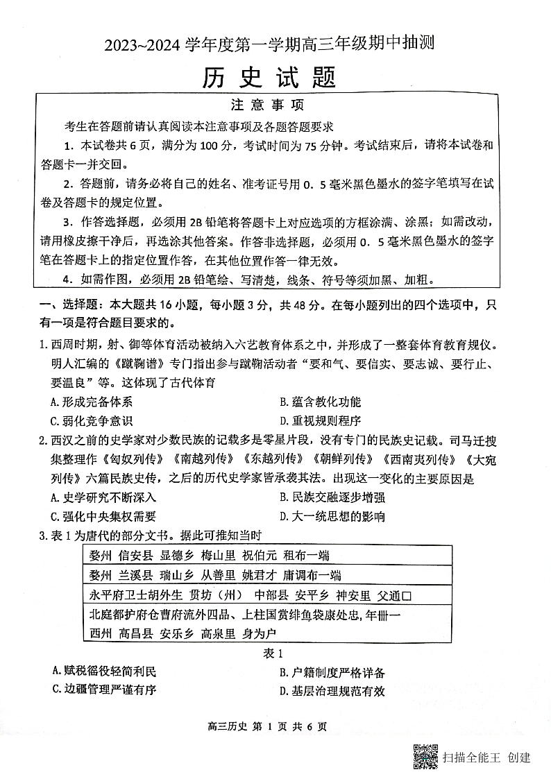 江苏省徐州市2023-2024学年高三上学期11月期中考试 历史