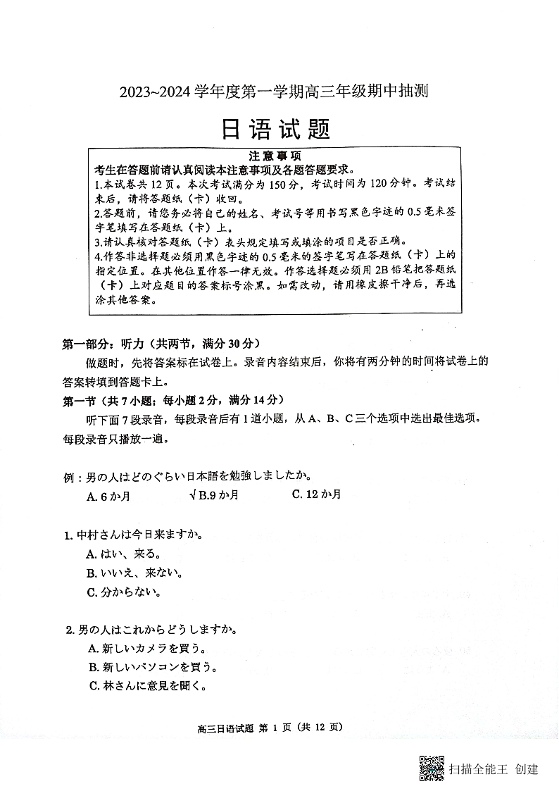 江苏省徐州市2023-2024学年高三上学期11月期中考试 日语
