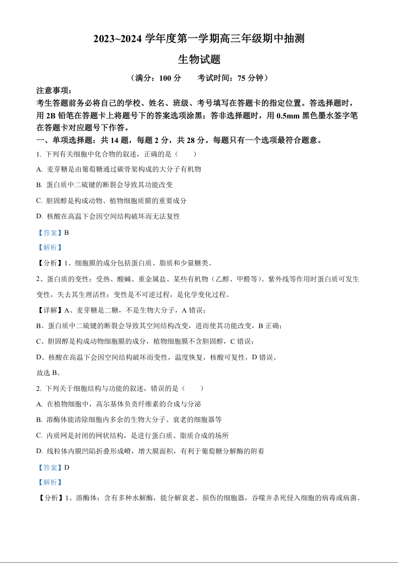 江苏省徐州市2023-2024学年高三上学期11月期中考试 生物答案