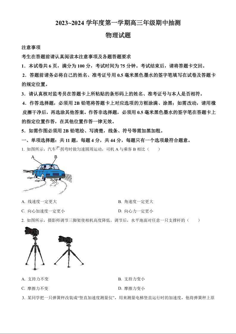 江苏省徐州市2023-2024学年高三上学期11月期中考试 物理
