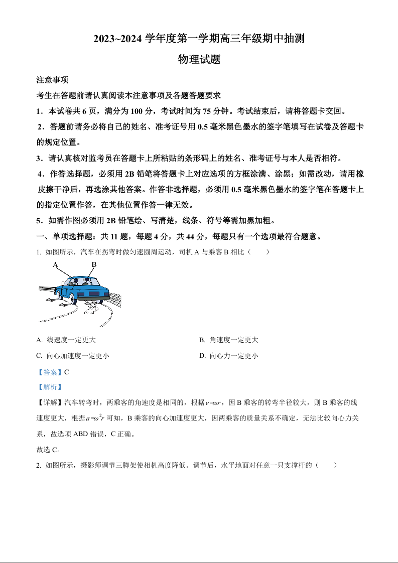 江苏省徐州市2023-2024学年高三上学期11月期中考试 物理答案