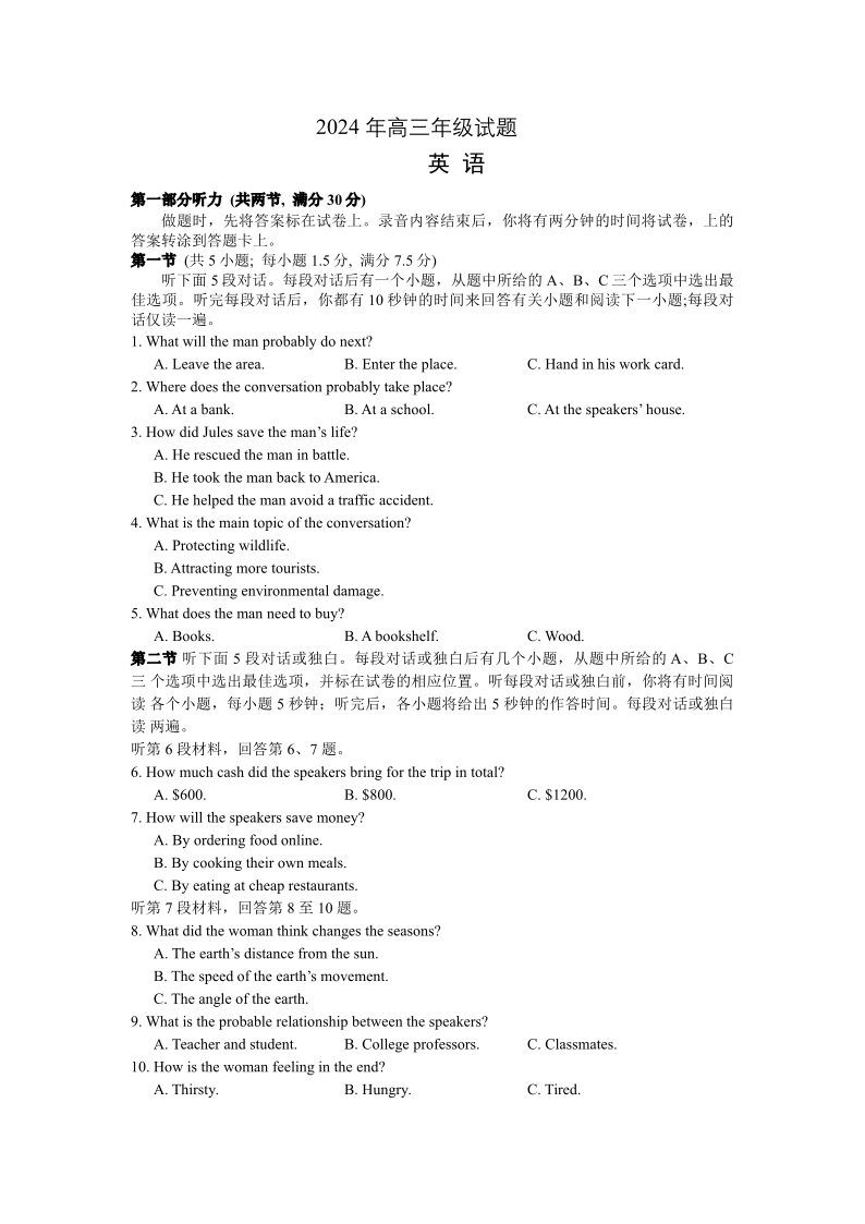 江苏省徐州市2024届高三下学期6月考前打靶试题+英语