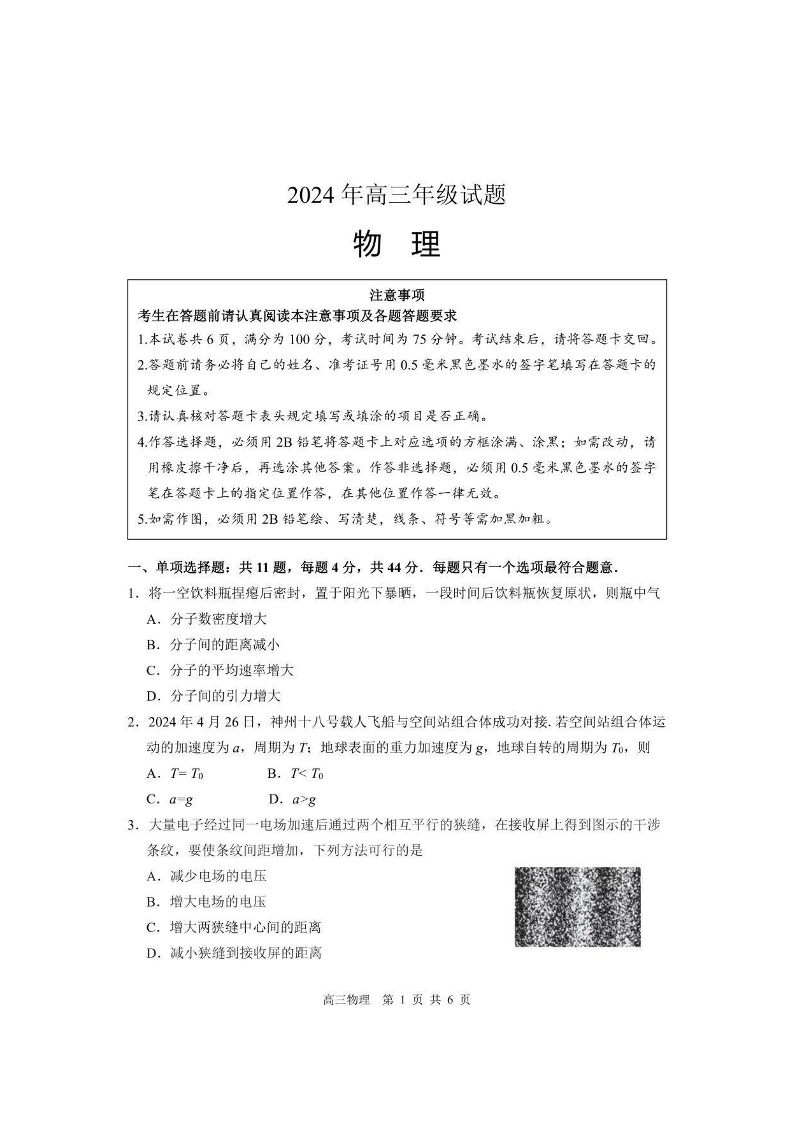 江苏省徐州市2024届高三下学期6月考前打靶试题+物理