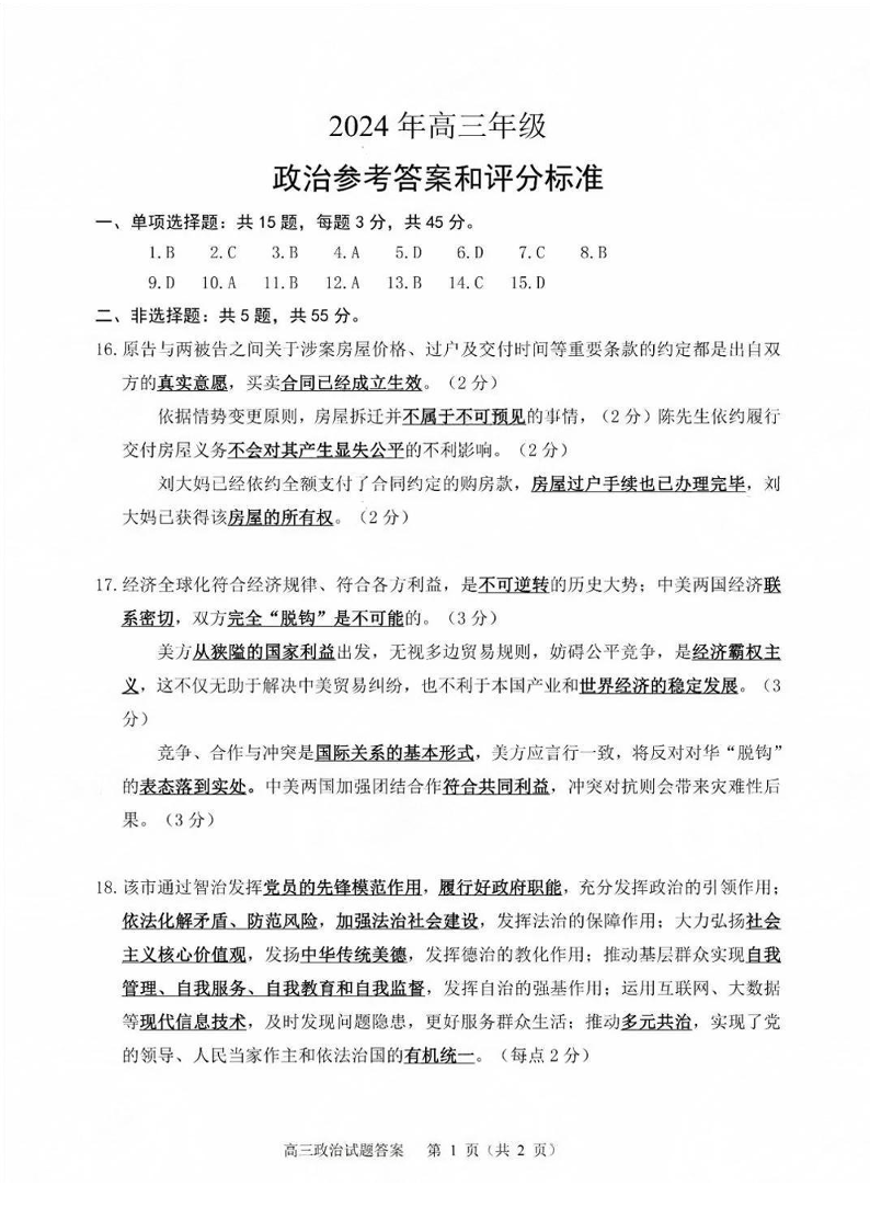 江苏省徐州市2024届高三下学期6月考前打靶试题+政治答案