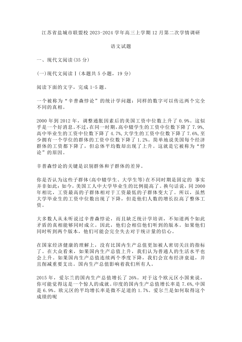 江苏省盐城市2023-2024学年度第一学期联盟校第二次联考 语文