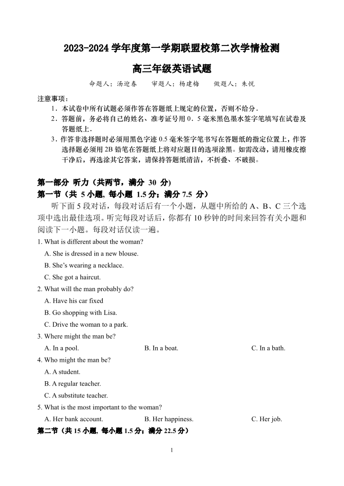 江苏省盐城市2023-2024学年度第一学期联盟校第二次联考 英语