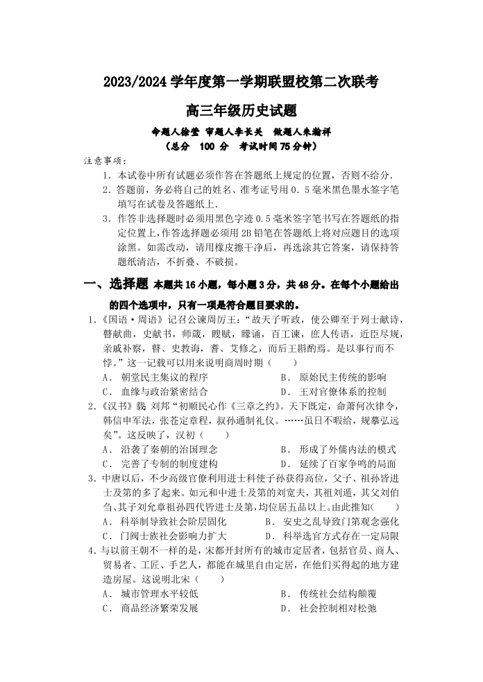 江苏省盐城市2023-2024学年度第一学期联盟校第二次联考 历史