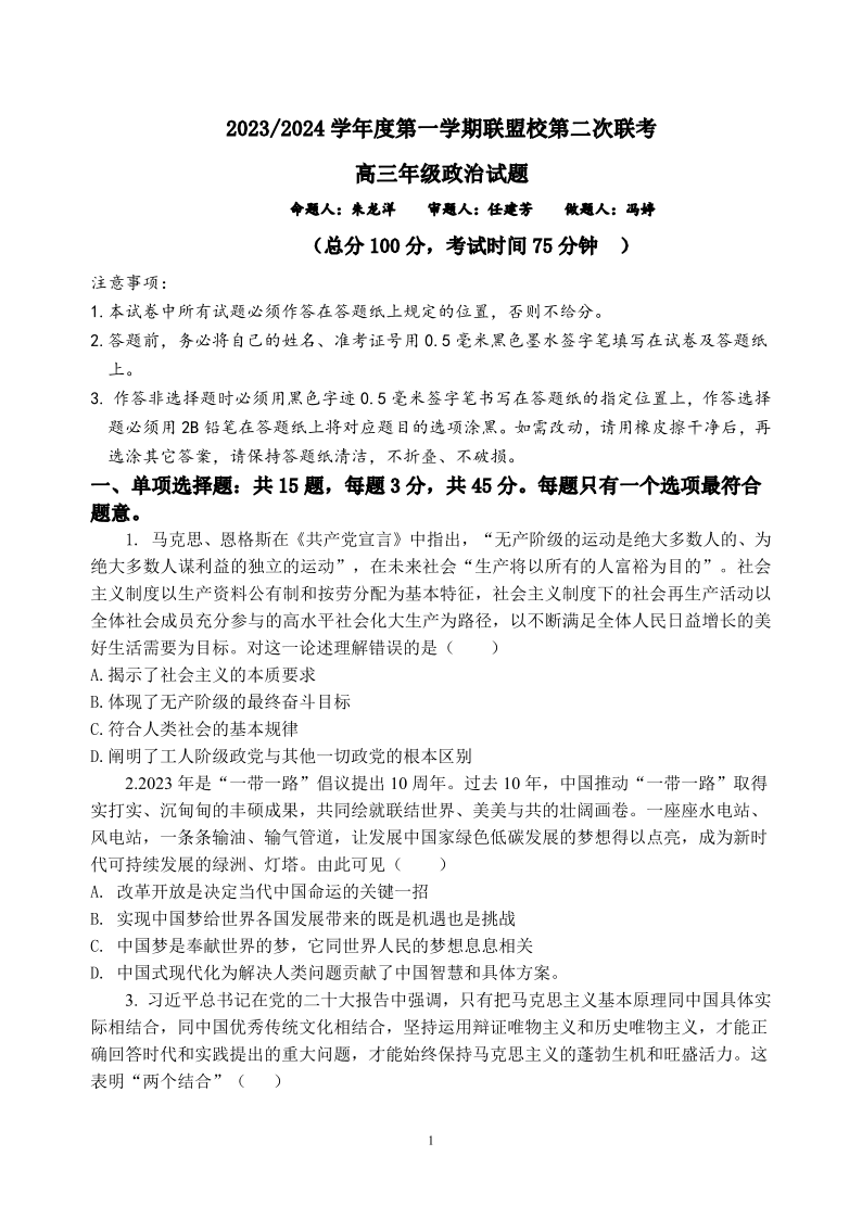 江苏省盐城市2023-2024学年度第一学期联盟校第二次联考 政治