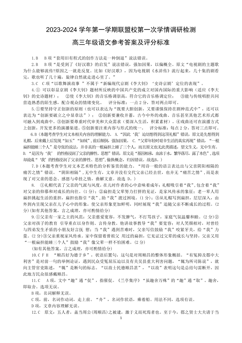 江苏省盐城市联盟校2023-2024学年高三上学期第一次学情调研检测 语文答案