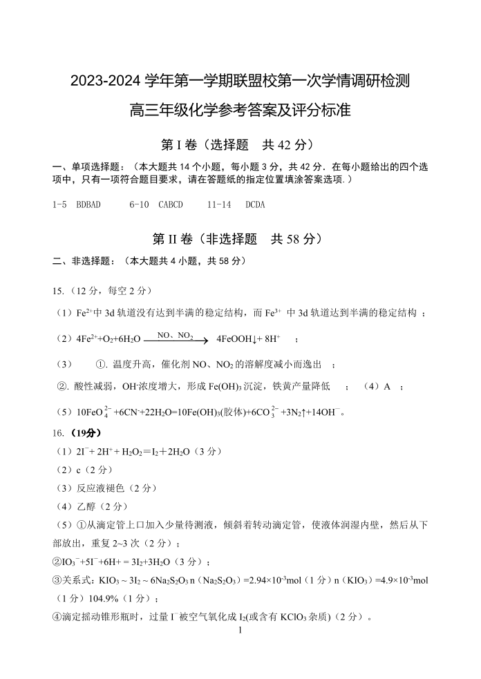 江苏省盐城市联盟校2023-2024学年高三上学期第一次学情调研检测 化学答案