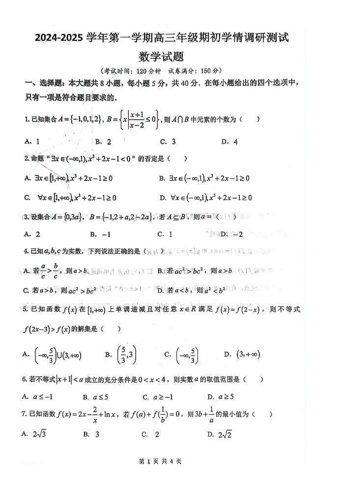 江苏省扬州市2024-2025学年高三上学期开学考试+数学