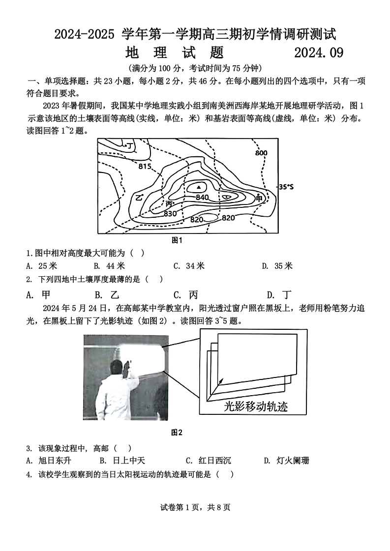 江苏省扬州市2024-2025学年高三上学期开学考试+地理