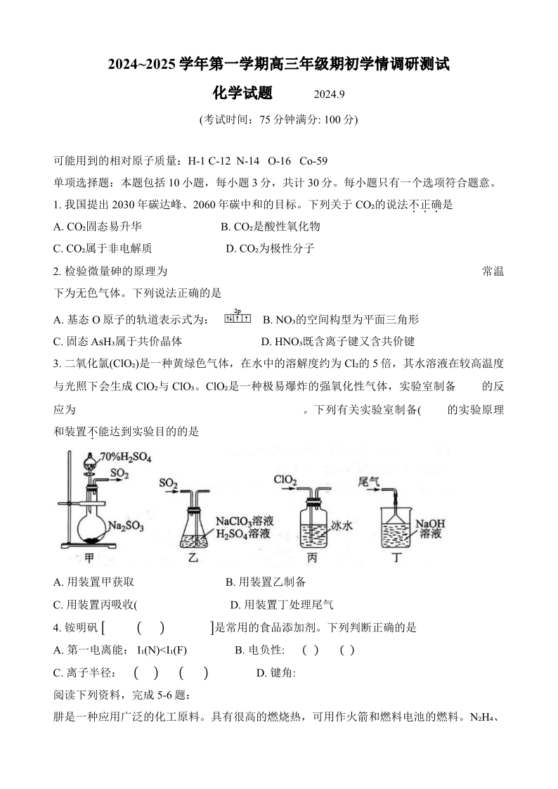 江苏省扬州市2024-2025学年高三上学期开学考试+化学