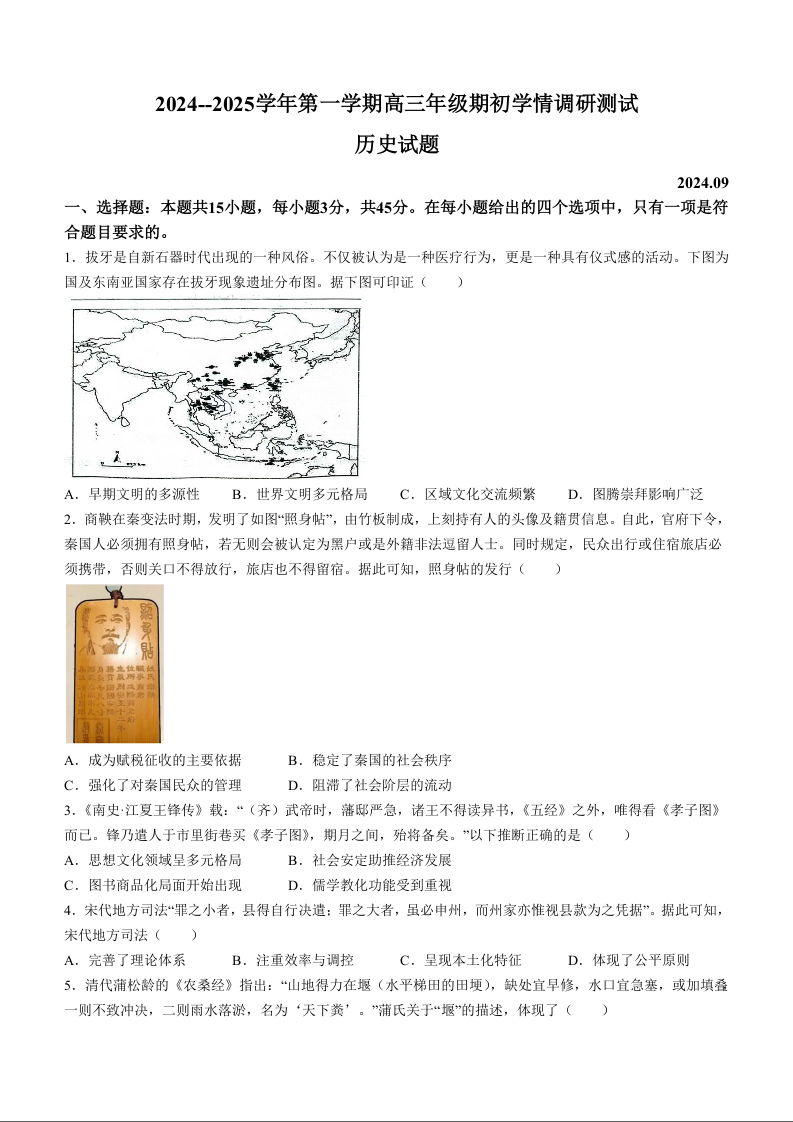 江苏省扬州市2024-2025学年高三上学期开学考试+历史