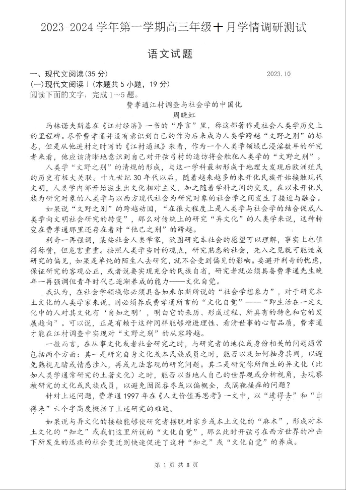 江苏省扬州市高邮市2023-2024学年高三上学期10月学情调研测试 语文