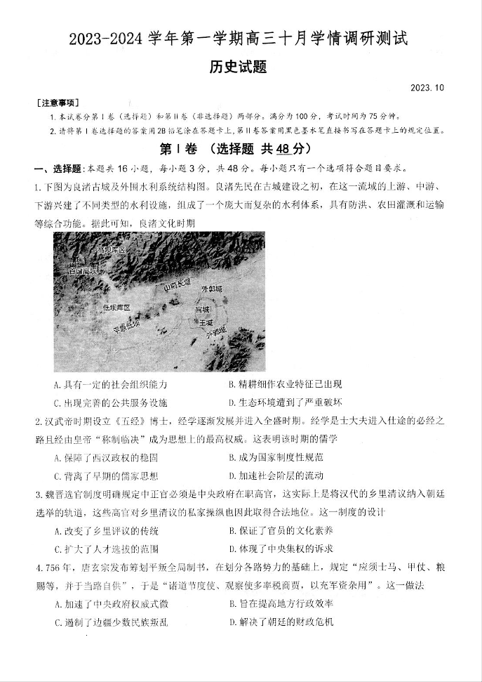 江苏省扬州市高邮市2023-2024学年高三上学期10月学情调研测试 历史