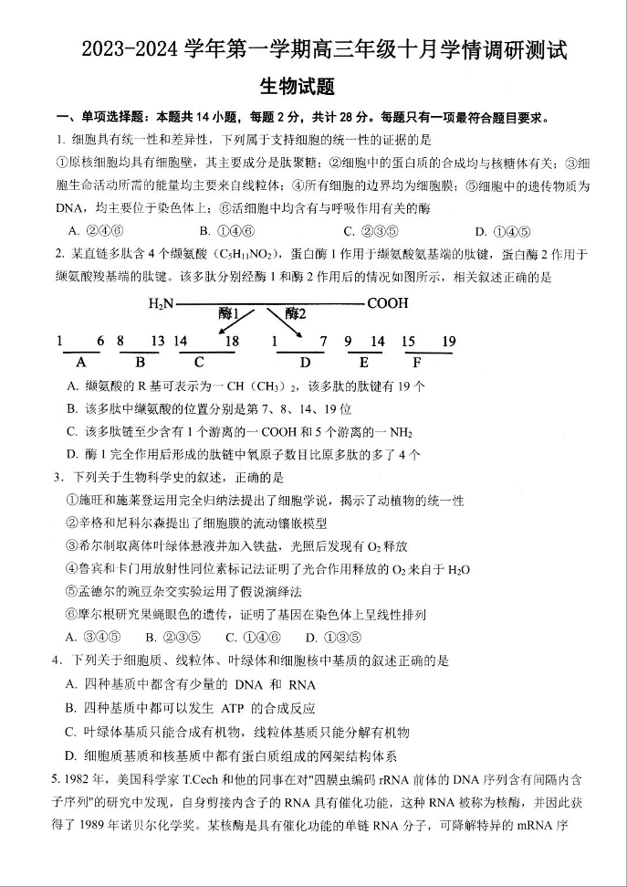 江苏省扬州市高邮市2023-2024学年高三上学期10月学情调研测试 生物