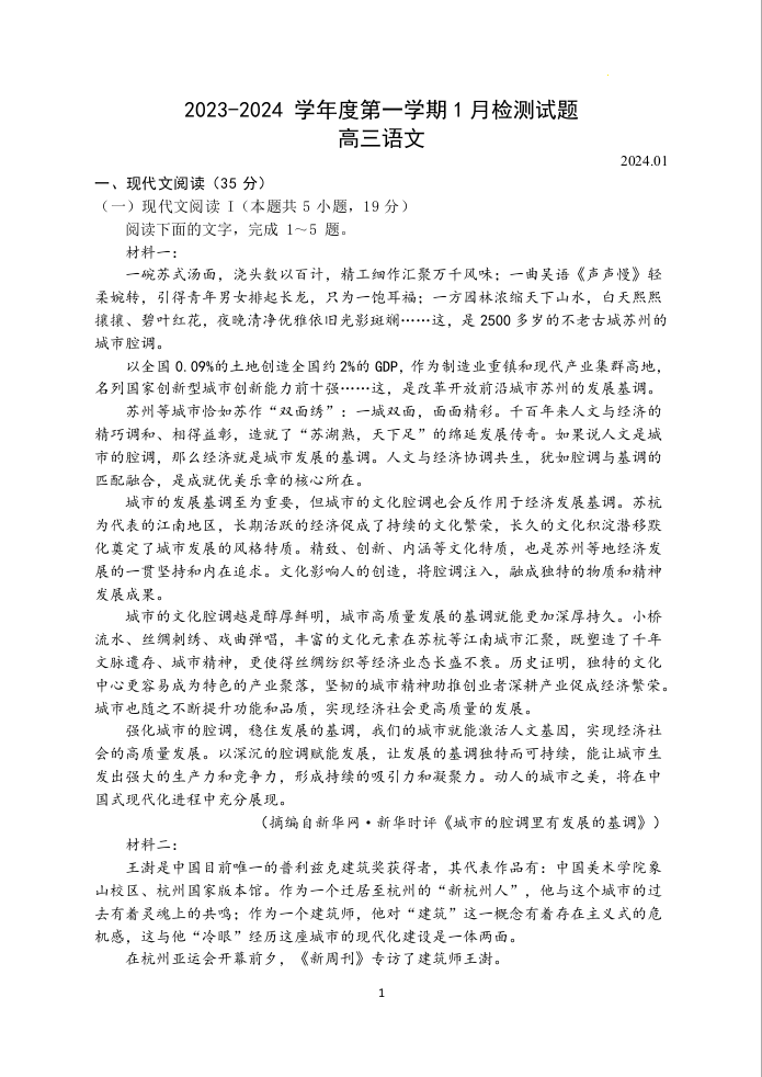 江苏省扬州中学2023-2024学年高三上学期1月月考 语文