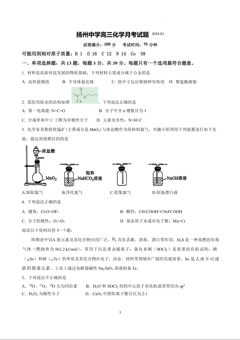 江苏省扬州中学2023-2024学年高三上学期1月月考 化学