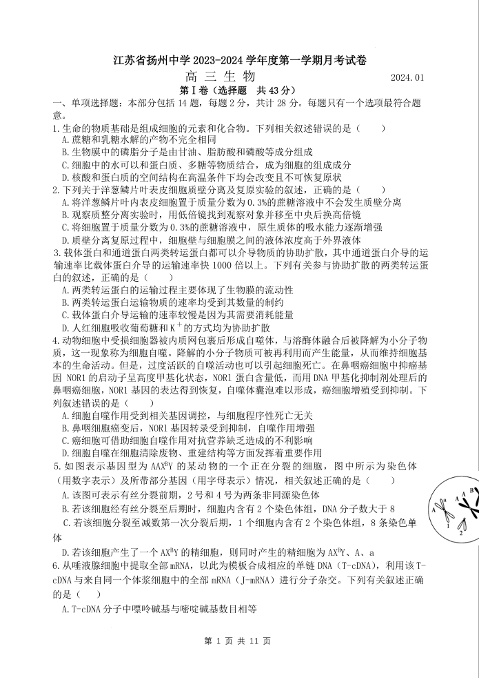 江苏省扬州中学2023-2024学年高三上学期1月月考 生物