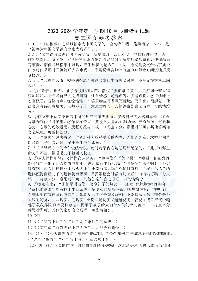 江苏省扬州中学2023-2024学年高三上学期10月月考 语文答案