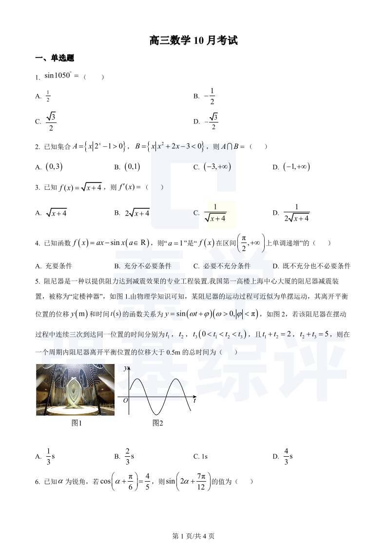 江苏省扬州中学2023-2024学年高三上学期10月月考 数学