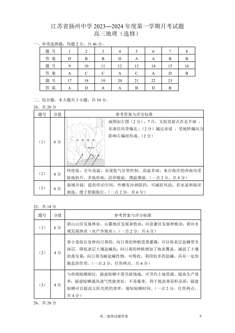 江苏省扬州中学2023-2024学年高三上学期10月月考 地理答案