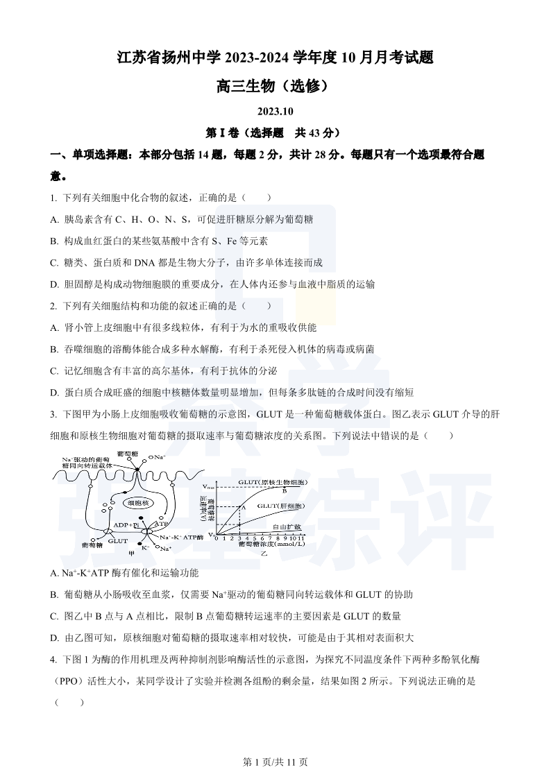 江苏省扬州中学2023-2024学年高三上学期10月月考 生物