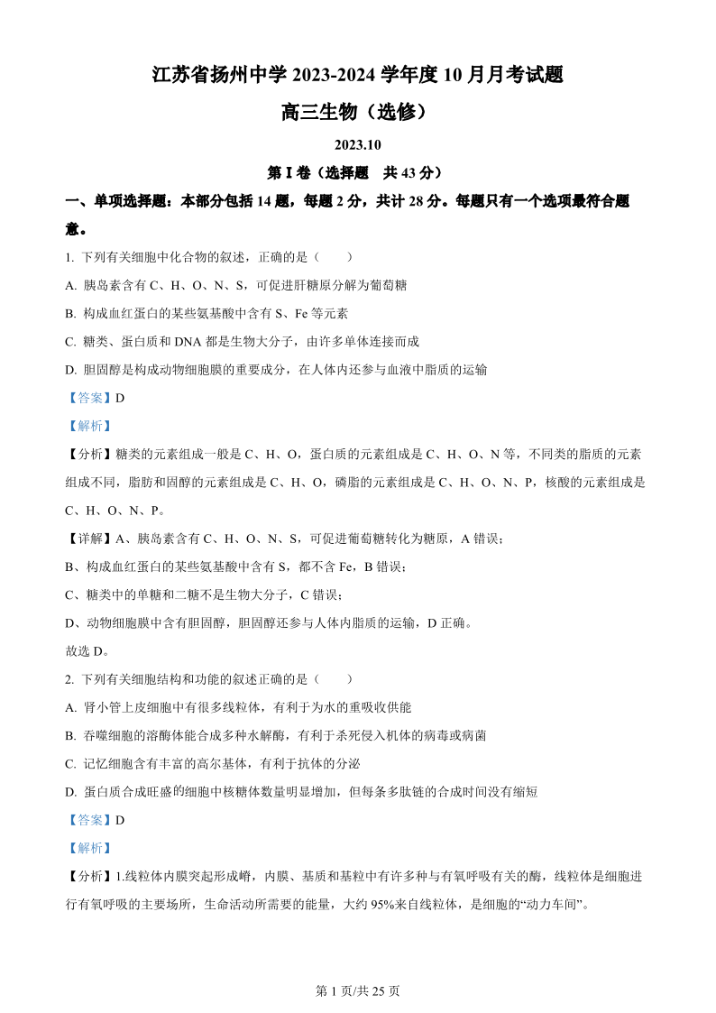 江苏省扬州中学2023-2024学年高三上学期10月月考 生物答案