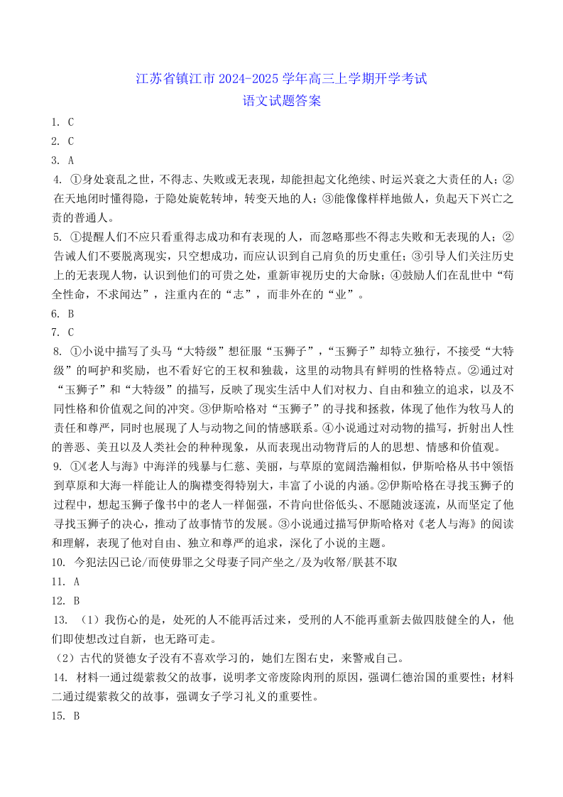 江苏省镇江市2024~2025学年第一学期期初高三质量监测+语文答案
