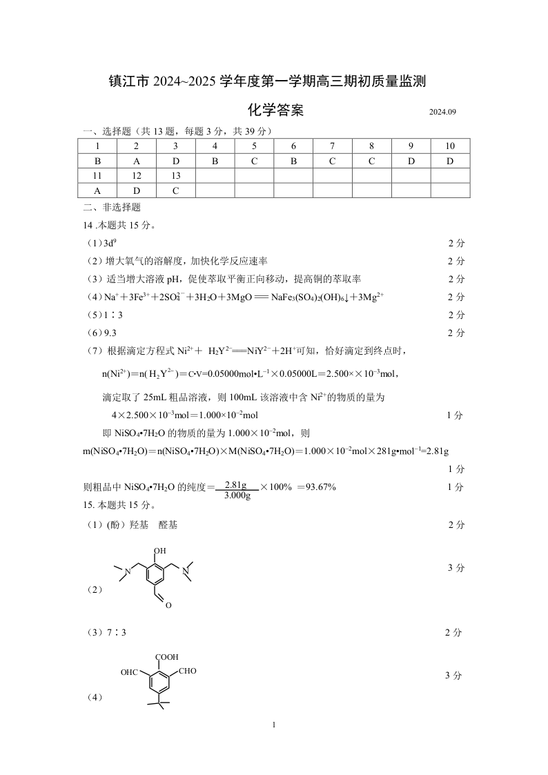 江苏省镇江市2024~2025学年第一学期期初高三质量监测+化学答案