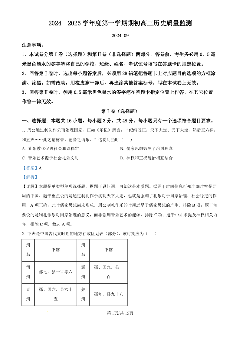 江苏省镇江市2024~2025学年第一学期期初高三质量监测+历史答案
