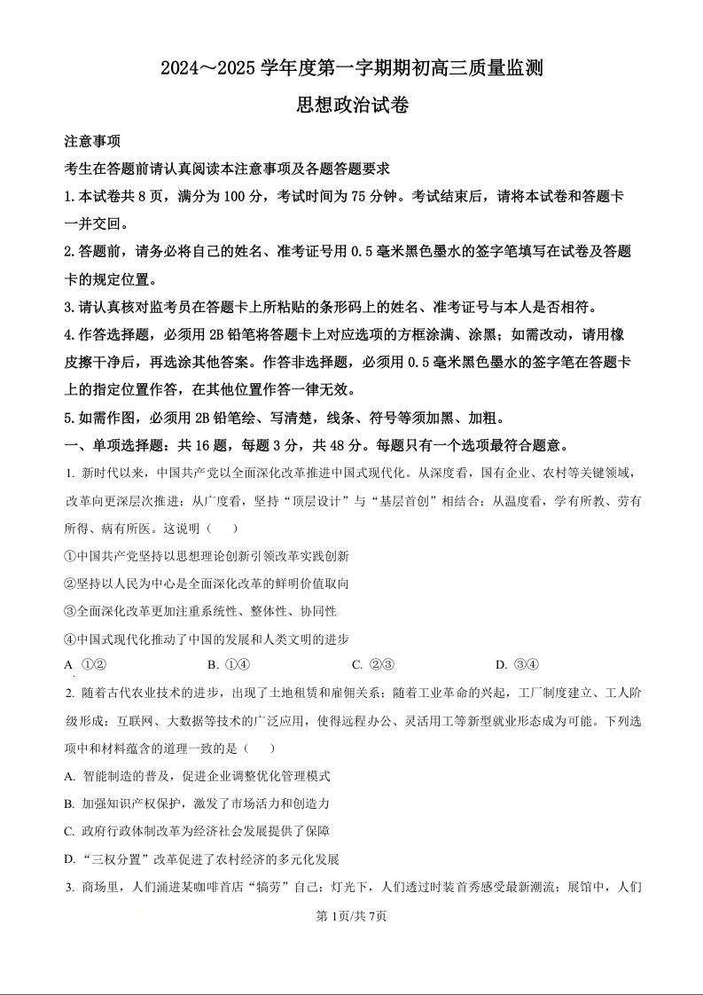 江苏省镇江市2024~2025学年第一学期期初高三质量监测+政治