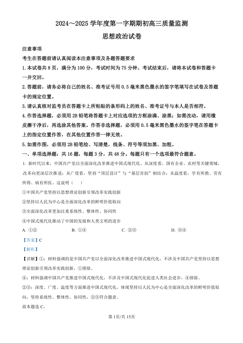 江苏省镇江市2024~2025学年第一学期期初高三质量监测+政治答案