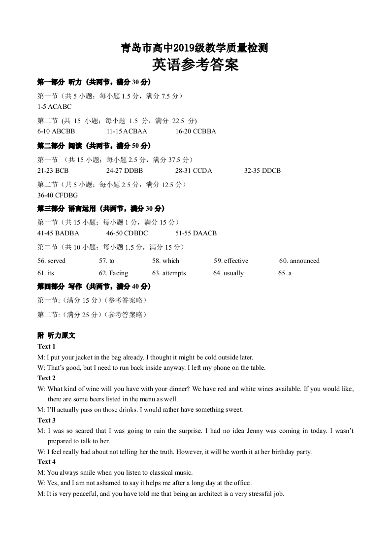山东省青岛市2021.9高三年级开学教学质量检测英语答案