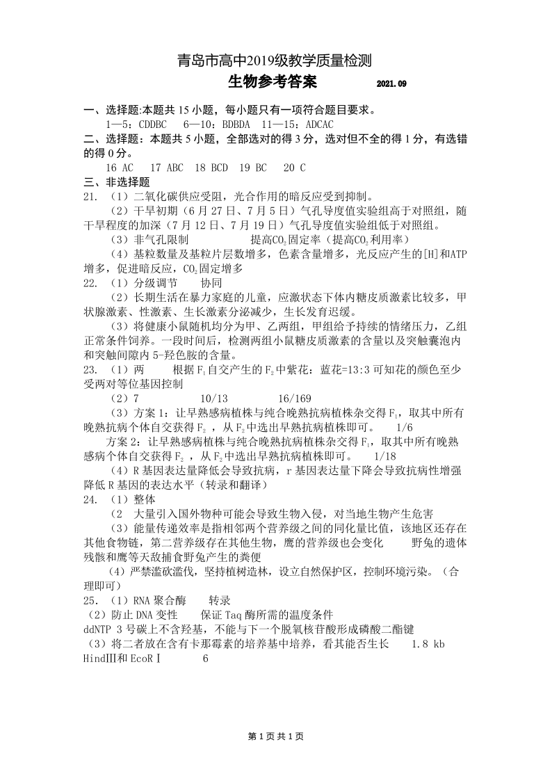 山东省青岛市2021.9高三年级开学教学质量检测生物答案