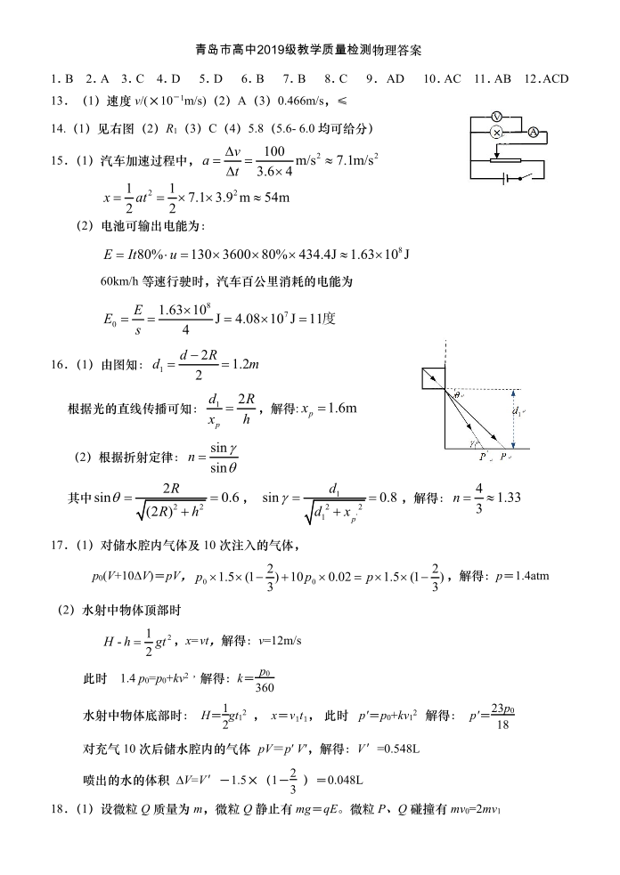 山东省青岛市2021.9高三年级开学教学质量检测物理答案
