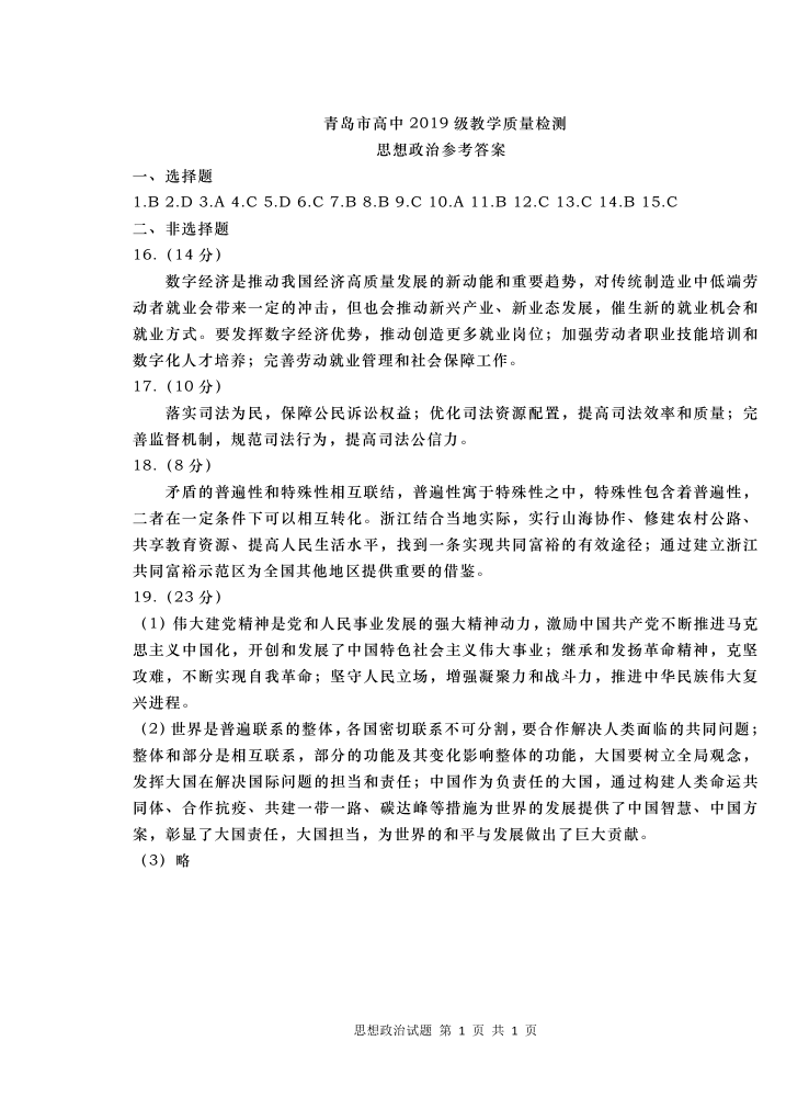 山东省青岛市2021.9高三年级开学教学质量检测政治答案