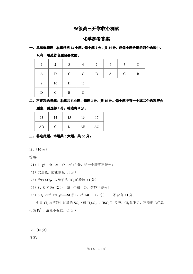 济南市历城二中2021.9高三年级开学检测化学答案