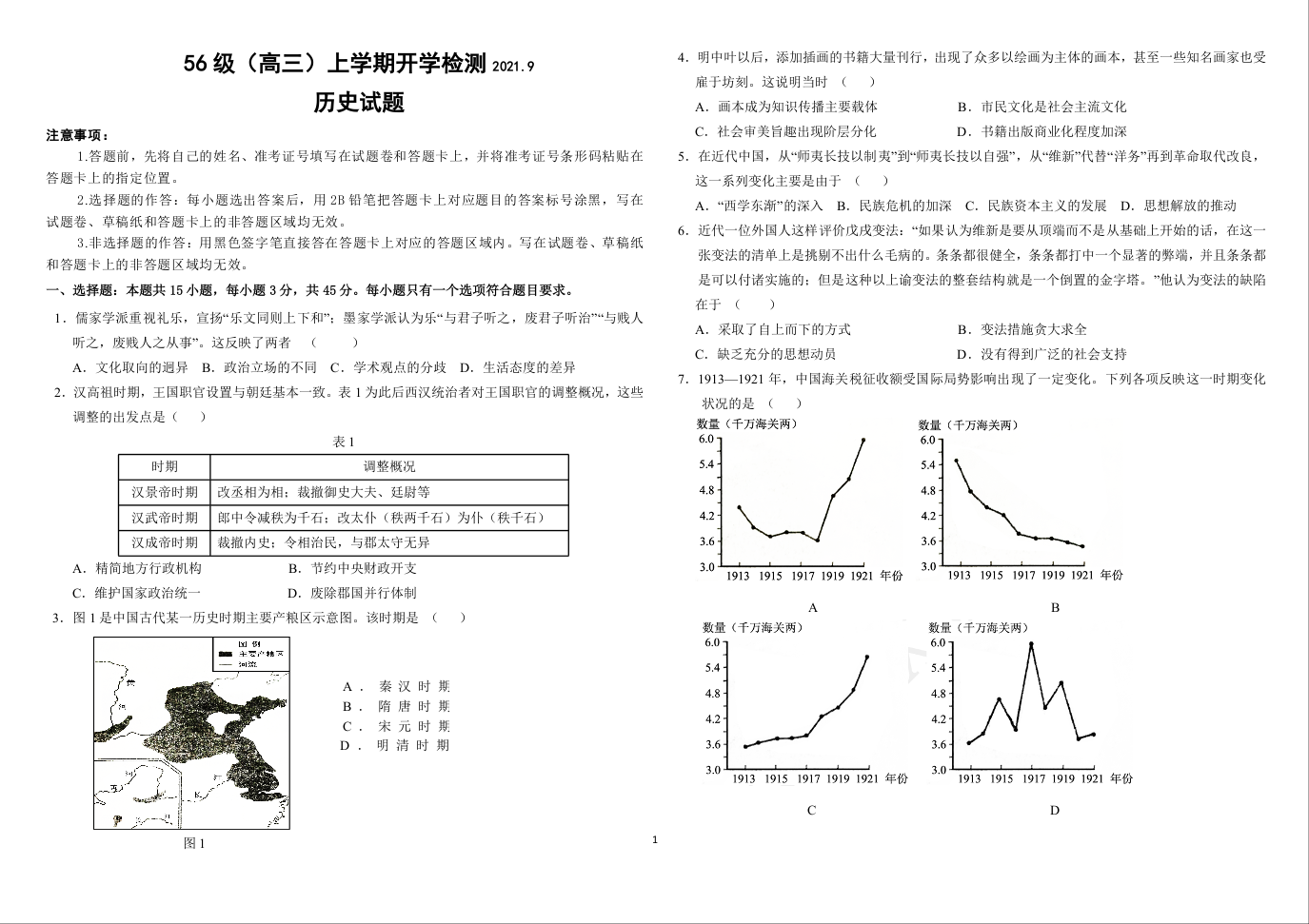 济南市历城二中2021.9高三年级开学检测历史及答案