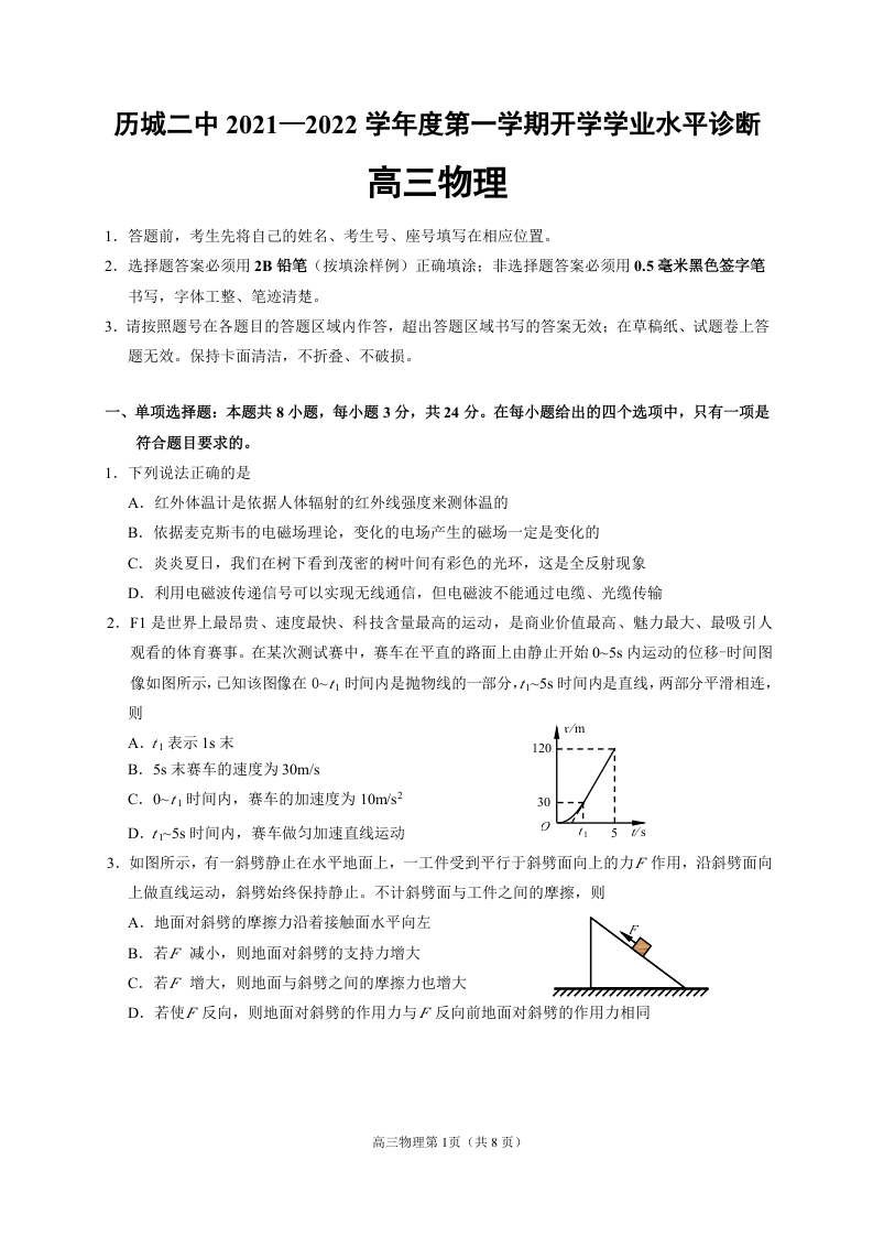 济南市历城二中2021.9高三年级开学检测物理及答案