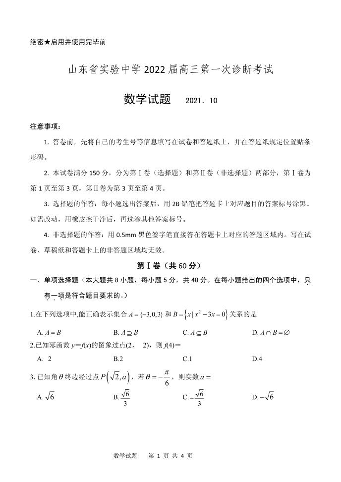 山东省实验中学2021.10高三年级第一次诊断考试数学