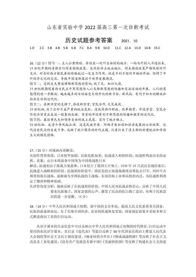 山东省实验中学2021.10高三年级第一次诊断考试历史答案