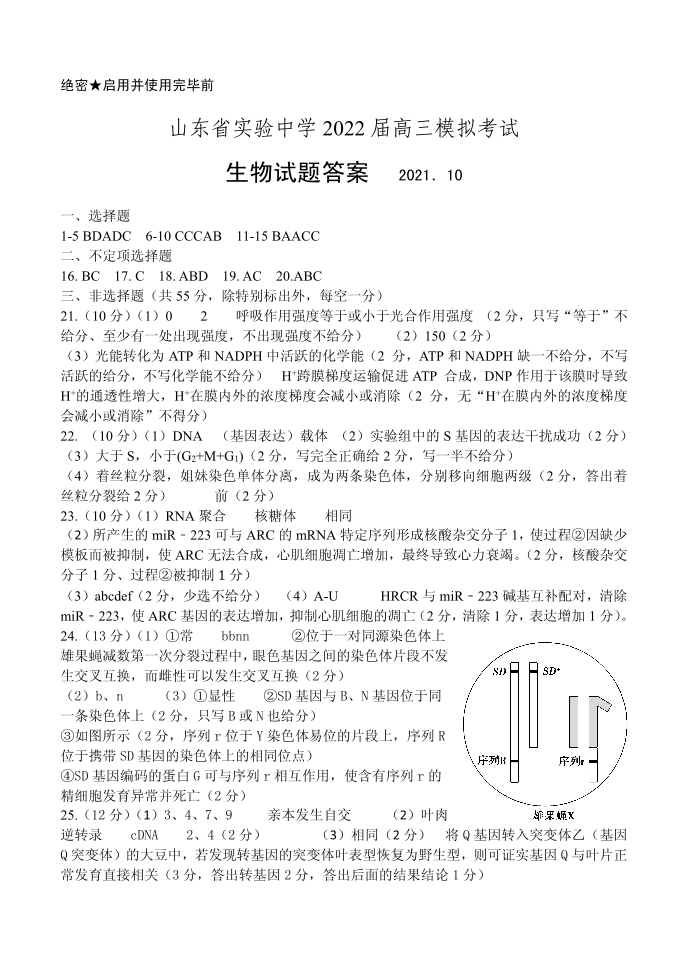 山东省实验中学2021.10高三年级第一次诊断考试生物答案