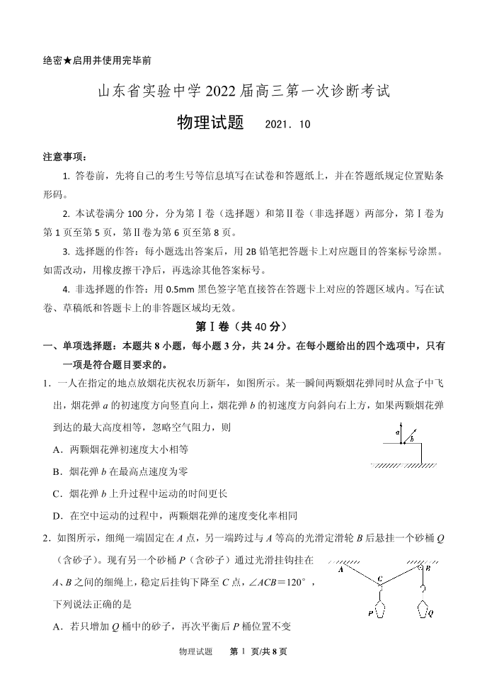 山东省实验中学2021.10高三年级第一次诊断考试物理