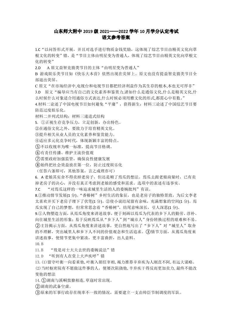 山东师大附中2021.10高三年级阶段检测语文答案