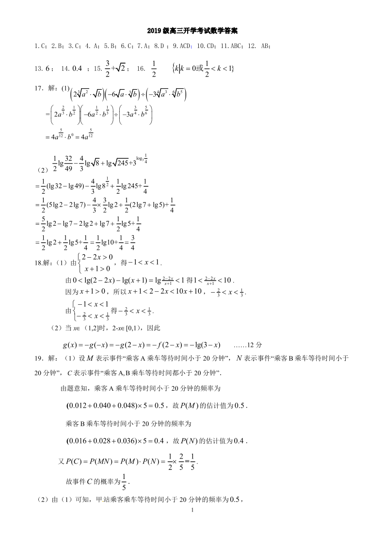 山东师大附中2021.10高三年级阶段检测数学答案