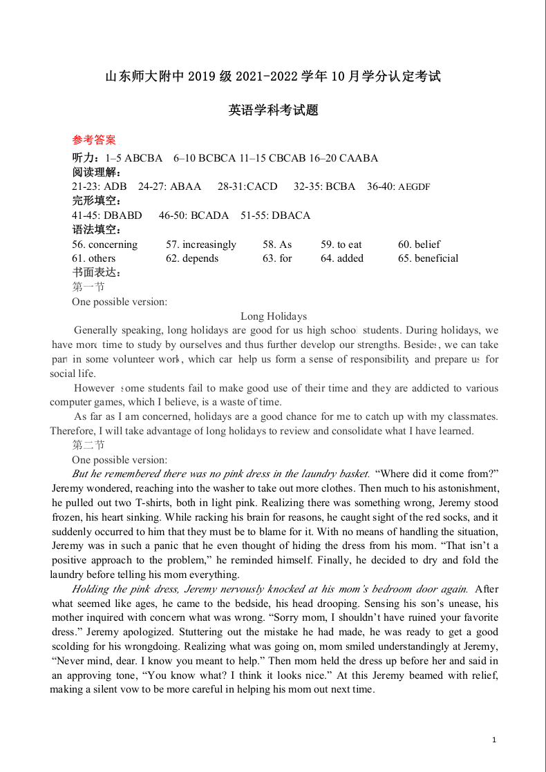 山东师大附中2021.10高三年级阶段检测英语答案