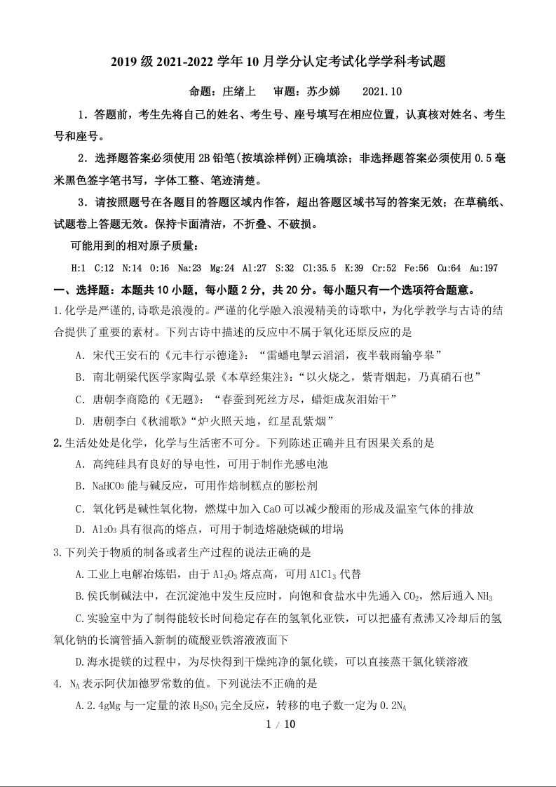 山东师大附中2021.10高三年级阶段检测化学