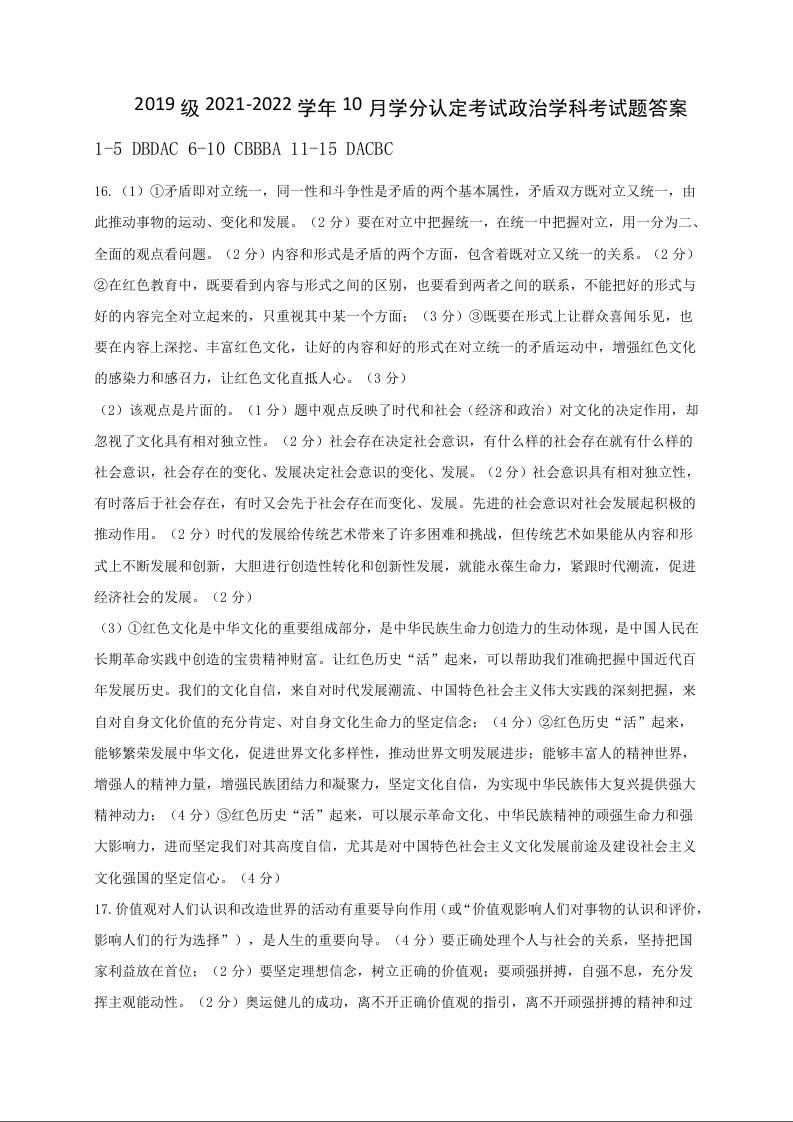山东师大附中2021.10高三年级阶段检测政治答案